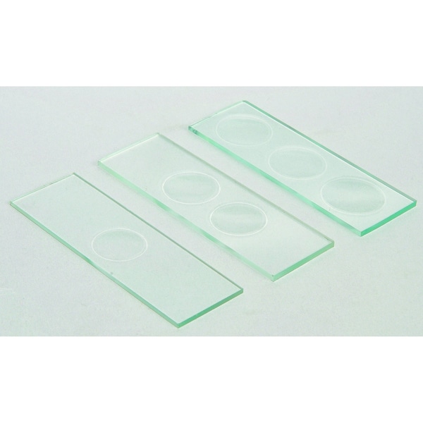 Pre-cleaned slides with concavities are 75mm x 25mm, 1.3mm thick, and are packaged in boxes of 12. Spherical concavities are approximately 16mm in diameter and 0.8mm deep. Available with single, double, or triple concavities. Made of quality sheet glass, with ground edges.