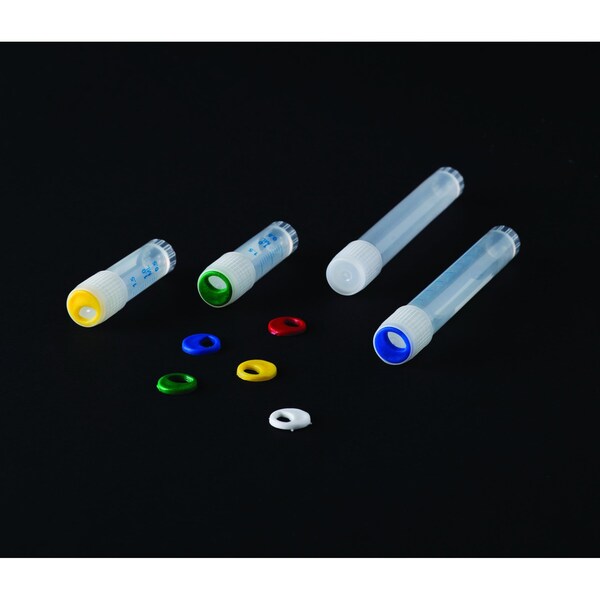 Pack of 100 white coders provide visual identification of specific cryogenic vials to help organize inventory. Designed to fit closures on United Scientific's skirted base cryogenic vials (P60102 and P60103).