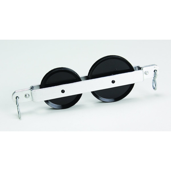 Free-running double tandem pulley with plastic sheaves, 40mm and 50mm in diameter. Designed with plated aluminum frame and hooks on both ends.