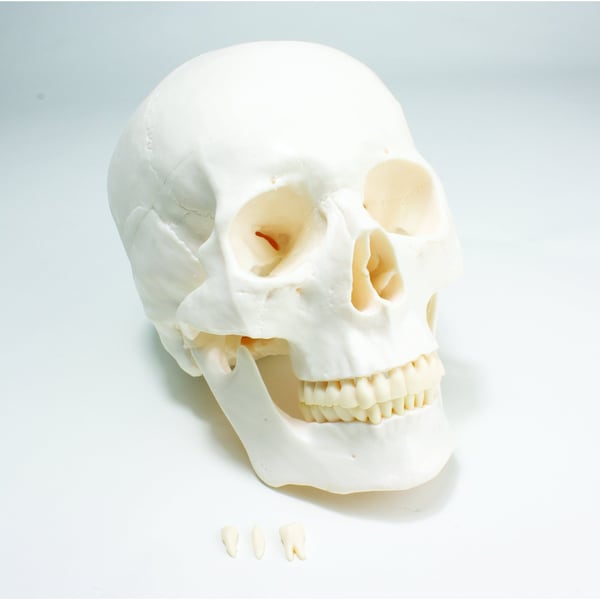 This life-sized skull model is excellent for introductory anatomy courses. The model shows excellent detail with a removable molar, incisor, and canine tooth for further study of the tooth roots. The mandible is spring mounted and the sectioned calvarium is detachable.