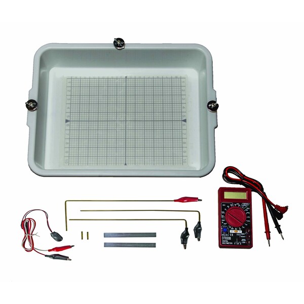 This comprehensive kit allows students to plot equipotential lines in an electric field between two electrodes held at different electric potentials. A simple setup keeps electrodes partially immersed in water containing an electrolyte, allowing a small current to flow between the electrodes. Students can then sample the resulting electric field using the included multimeter. Contents: Plastic trough, 33cm x 25cm, with printed orientation grid and fitted with three electrode support posts Wire harness with snap connector and two alligator clips 2 straight metal strip electrodes, 10cm long 2 short rod electrodes 2 electrode support arms Sample point arm Digital multimeter Activity guide