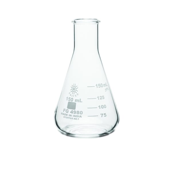 Pack of six narrow-mouth Erlenmeyer flasks with 150ml capacity. Borosilicate glass flasks are designed to give the best combination of thermal shock resistance and physical strength. Feature heavy-duty rims and graduations in durable white enamel.