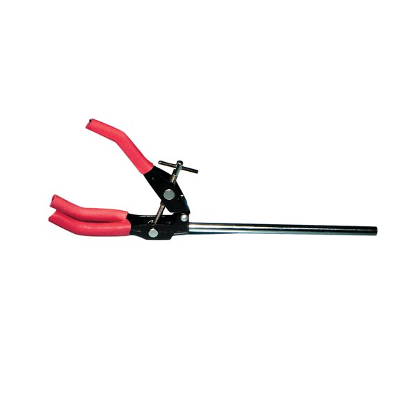 3-prong clamp attached to a chrome-plated steel extension rod. Prongs are covered with rubber for use in temperatures up to 60°C. Overall length is 10 inches.