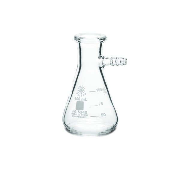 Pack of six borosilicate glass filtering flasks with 100ml capacity. Heavy-walled flasks feature a heavy-duty rim and bolt neck ideal for vacuum filtration. Graduations are printed in durable white enamel. United Scientific flasks deliver an unbeatable combination of thermal shock resistance and physical strength. A vacuum can be applied in 5-minute intervals. When restarting the vacuum, make sure to release the current vacuum to ensure proper pressure management. The pressure of the air that is removed should never exceed 600 mm Hg at any point in time.