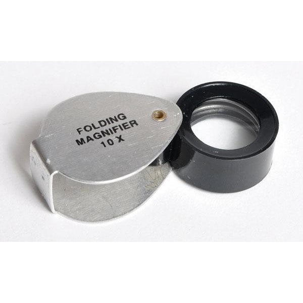 Single folding magnifier folds into a protective aluminum case. Features a glass 10x magnification lens, 25mm in diameter and mounted in a plastic frame.