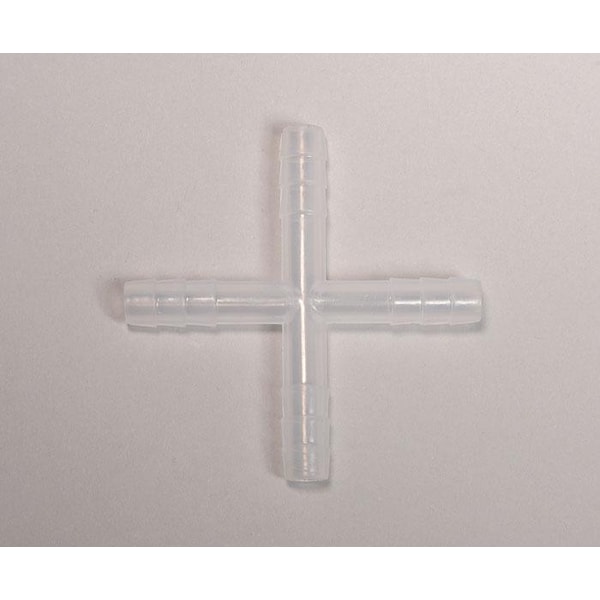 Polypropylene cross-shaped connectors with serrated ends are ideal for leak-proof tubing connections. Autoclavable.