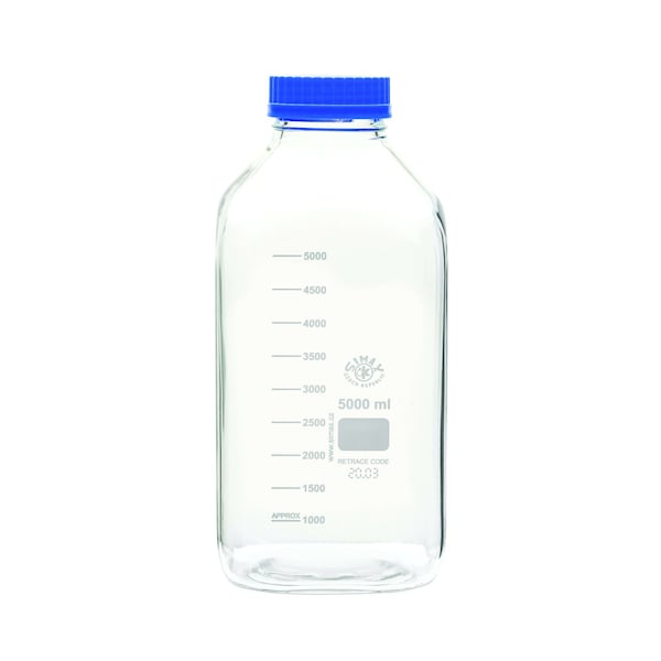 Wide-mouth, square-shaped media bottle with 5000ml capacity. Features easy-to-read imprinted graduations and durable marking spot. GL80 Polypropylene screw cap is included. Autoclavable.