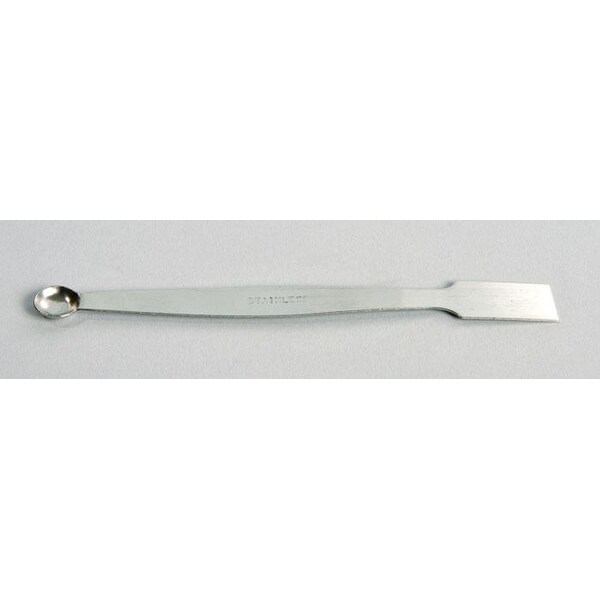 Pack of 10 stainless steel lab spatulas with one flat end and one spoon end. Each tool measures 8" long.