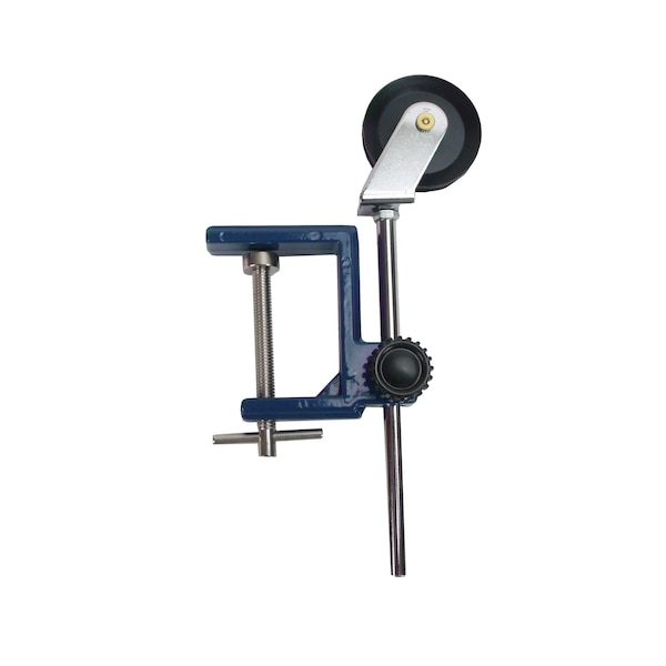 This large ABS plastic pulley connects easily to table edges up to 53 mm thick. The 50 mm diameter smooth rotating pulley is attached to a 140 mm steel rod. This adjustable 8 mm diameter rod can be positioned and secured using the locking knob mechanism. Vertical range of the top of the pulley to the table top is 27 mm to 140 mm.