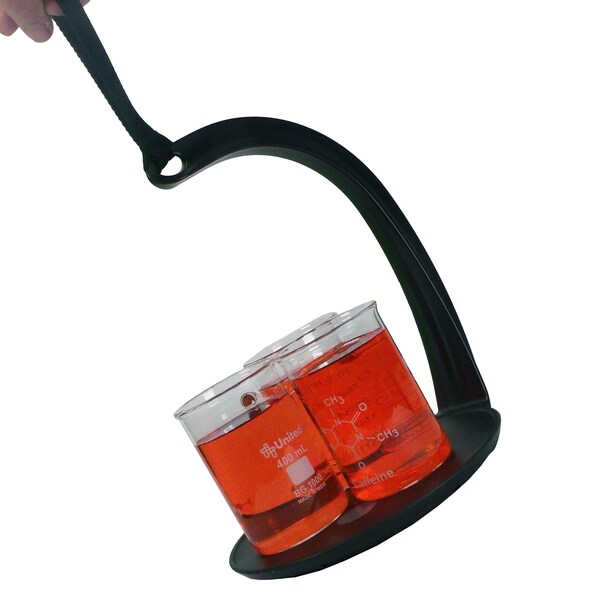 The SpillNot Plus is an inexpensive demonstration to intrigue students and challenge their analytical powers! Using the principles of Newtonian physics, this device keeps liquid in a container when it is swung back and forth. The large design of the SpillNot Plus holds three glasses at once. The flexible handle and the location of the suspension point above the center of the tray ensure that the forces on the liquid are always directed towards the supporting tray, even when the tray is in motion. The sideways forces that are usually responsible for spills are not transmitted to the tray by the flexible handle and the radial forces generated during swinging motion only pin the liquid into the container more firmly.