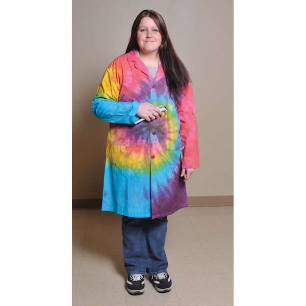 Knee-length lab coat made of easy-care 100% cotton with vibrant tie-dyed pattern. Features one upper left breast pocket, two roomy lower pockets, side pocket slit openings, and a sewn-down back belt. Unisex, Size XXL.