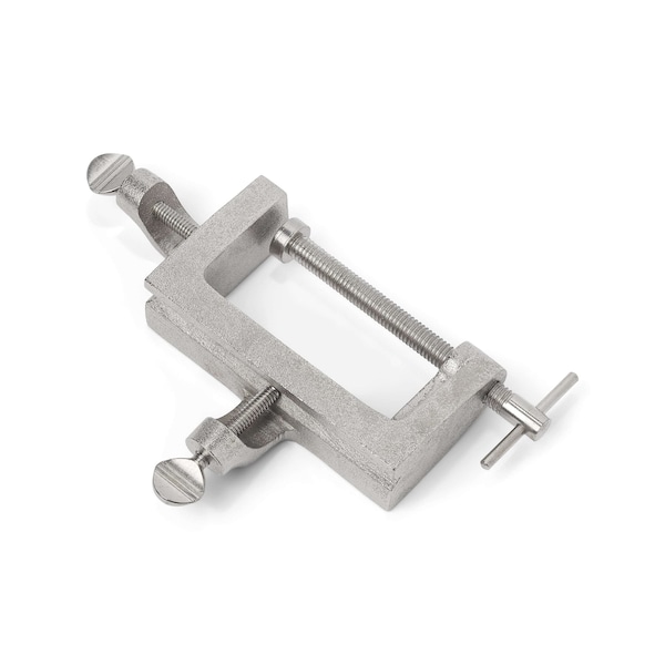 Two-way clamp and thumbscrews hold rods firmly in horizontal or vertical positions. For use with rods up to 3/4†in diameter. The cast aluminum, nickel-plated clamp mounts onto tabletops or other surfaces up to 3†thick. Screw mechanisms are made of nickel-plated steel. Rods are not included. Hold rods vertically or horizontally. Cast aluminum, nickel-plated clamp. Easy to adjust, nickel-plated steel thumbscrews. Fits surfaces up to 3†thick.