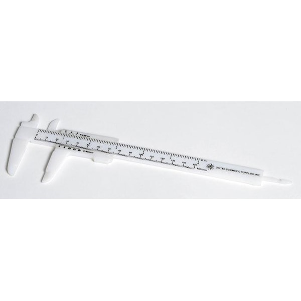 Vernier caliper with polypropylene construction. Dual scale range is 6" or 150mm. Graduated in 1/128" and 0.05mm intervals.