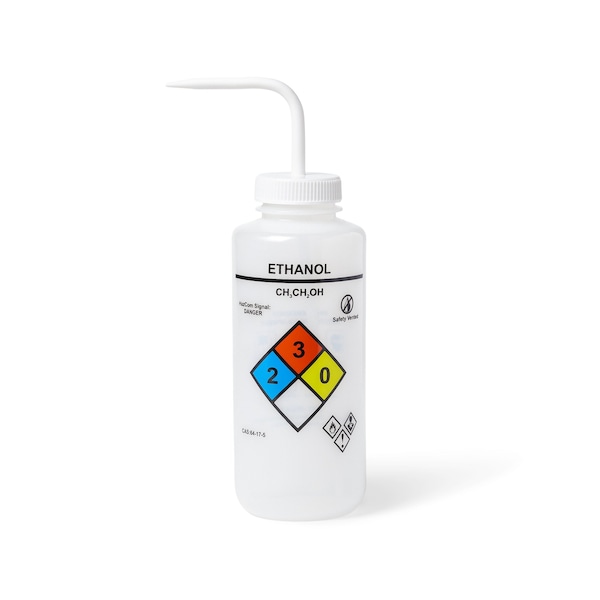 UniSafe vented wash bottles are made from industrial grade low-density polyethylene with polypropylene stem closure and venting assembly. They are pre-printed with the Chemical name and formula, the National Fire Protection Association (NFPA) Section 704 Four-color Diamond, health hazards, Chemical Abstract System (CAS) number, and suggested protective clothing and equipment. Each bottle is compliant with GHS and OSHA requirements outlined in Hazard Communication Standard 29 CFR 1910.1200. Intended for use only with LDPE and PP compatible solvents.