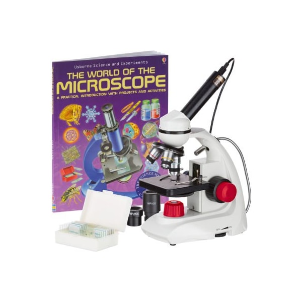 This is a portable, monocular compound microscope. Along with the led transmitted lighting, we include a free gooseneck led lamp which mounts behind the nospiece for reflected lighting. The microscope has five magnification levels 40x, 100x, 250x, 400x & 1000x when used with both sets of eyepieces. This microscope is suitable for both home use and field use as it can be used with batteries in addition to the ac power. This microscope is a great choice for kids who want to explore the microscopic world around them. to make things even better, this package includes a 640x480px digital camera for capturing photos and videos on a your computer. The camera replaces the eyepiece when in-use, and allows you to view the image on your computer monitor. We've also included a 10-piece slide kit, with five prepared slides pine stem, sunflower stem, onion epidermis, cotton stem and house fly leg and five blank slides, as well as a book to introduce the world of microscopy. features: a great affordable compound microscope dual led illumination. 45 degree inclined ocular tubes for comfort. stage includes clips for holding your slide in place coaxial coarse and fine focus adjustments for optimal focusing clarity and ease abbe condenser with disc diaphragm provides even illumination and control glass optical elements crystal clear sharp images high quality student microscope. perfect for up to high school students. five levels of magnification: 40x, 100x, 250x, 400x & 1000x battery power and ac power full optical glass elements excellent five 5 year factory warranty lowest price for the same guaranteed or the difference back!! satisfaction guaranteed or your money back!! specifications: nosepiece: triple. head: 45 degree inclined monocular. wide-field eyepiece: wf10x and 25x. achromatic objectives: 4x, 10x, 40x stage dimensions: 3-9/16in x 3-9/16in90mm x 90mm. condenser: na=0.65 with disc diaphragm. illumination: transmitted led and reflected