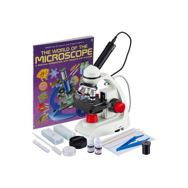 This is a portable, monocular compound microscope. Along with the led transmitted lighting, we include a free gooseneck led lamp which mounts behind the nospiece for reflected lighting. The microscope has five magnification levels 40x, 100x, 250x, 400x & 1000x when used with both sets of eyepieces. The digital camera captures still images and video, and allows you to view a live stream on your pc. The included software for windows offers image-development and measurement tools, as well as advanced compositing features such as image-stitching and extended-depth-of-focus. Independent preview and capture resolutions allow you to view high-speed video while capturing high-definition images. On mac computers, the camera can be used as a driverless imaging device, compatible with various applications, such as proscope and photo booth. This microscope has solid, metal framework, and is suitable for both home use and field use as it can be used with batteries in addition to the ac power. This microscope is a great choice for kids who want to explore the microscopic world around them. along with some prepared biological-specimen slides, this kit also includes a slide-preparation kit, with blank slides, red and blue stains, and several tools to put together your own specimen slides. As well, we've included the book inthe world of the microscopein as an introduction to microscopy. This is an ideal microscopy package for home school or for students from elementary to high school. features: a great affordable compound microscope dual led illumination. 45 degree inclined ocular tubes for comfort. stage includes clips for holding your slide in place coaxial coarse and fine focus adjustments for optimal focusing clarity and ease abbe condenser with disc diaphragm provides even illumination and control glass optical elements crystal clear sharp images high quality student microscope. perfect for up to high school students. five levels of magnification: 40x, 100x, 250