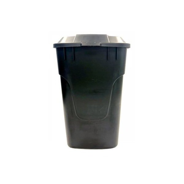 45 Gallon Black Base Trash Cart With Lid Wheeled Crush & Dent Resistant Design For Long Lasting Use Heavy Duty Wheels & Hinged Lid. 45 LB Load Capacity 55 Gallon Bag Size.