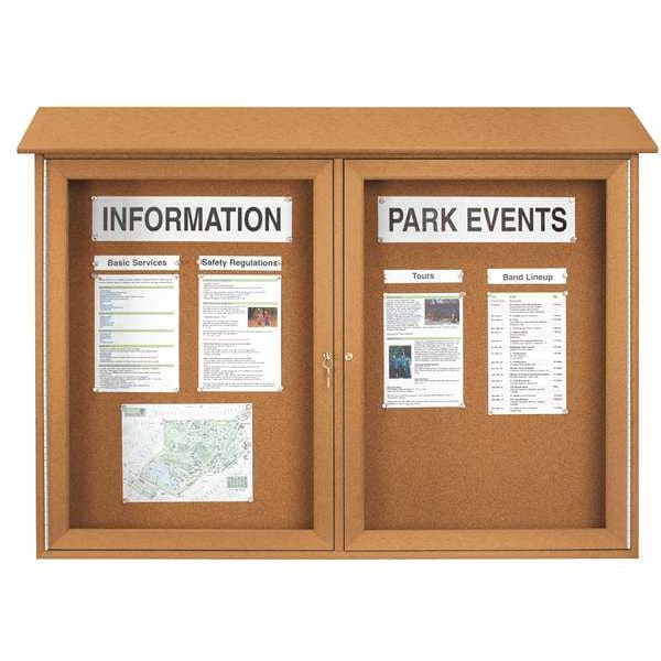 Enclosed Bulletin Board, Push-Pin, Board Material Natural Cork, Width 45 in, Height 36 in, Board Frame Material HDPE, Frame Color Cedar, Board Color Cedar, Number of Doors 2, Door Type Swing, Includes (2) Keys, Mounting/Mobility Type Post Mounted, Wall Mounted, Door Material Acrylic, Plastic, Outdoor Enclosed Bulletin Board
