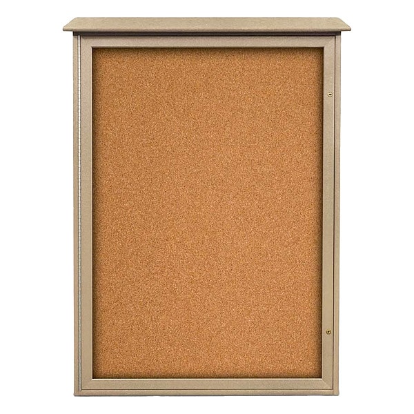 Enclosed Bulletin Board, Push-Pin, Board Material Natural Cork, Width 38 in, Height 54 in, Board Frame Material HDPE, Frame Color Sand, Board Color Sand, Number of Doors 1, Door Type Swing, Includes (2) Keys, Mounting/Mobility Type Post Mounted, Wall Mounted, Door Material Acrylic, Plastic, Outdoor Enclosed Bulletin Board