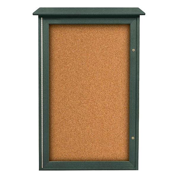 Enclosed Bulletin Board, Push-Pin, Board Material Natural Cork, Width 26 in, Height 42 in, Board Frame Material HDPE, Frame Color Green, Board Color Woodland Green, Number of Doors 1, Door Type Swing, Includes (2) Keys, Mounting/Mobility Type Post Mounted, Wall Mounted, Door Material Acrylic, Plastic, Outdoor Enclosed Bulletin Board