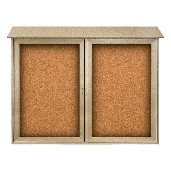 Enclosed Bulletin Board, Push-Pin, Board Material Natural Cork, Width 45 in, Height 36 in, Board Frame Material HDPE, Frame Color Sand, Board Color Sand, Number of Doors 2, Door Type Swing, Includes (2) Keys, Mounting/Mobility Type Post Mounted, Wall Mounted, Door Material Acrylic, Plastic, Outdoor Enclosed Bulletin Board