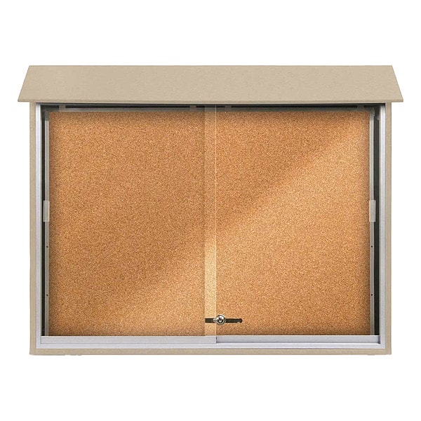 Enclosed Bulletin Board, Push-Pin, Board Material Natural Cork, Width 45 in, Height 36 in, Board Frame Material HDPE, Frame Color Sand, Board Color Sand, Number of Doors 2, Door Type Sliding, Includes (2) Keys, Mounting/Mobility Type Post Mounted, Wall Mounted, Door Material Acrylic, Aluminum, Outdoor Enclosed Bulletin Board