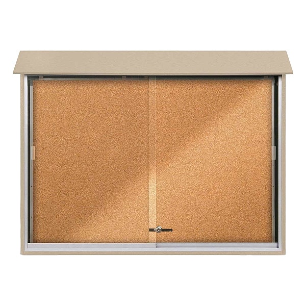 Enclosed Bulletin Board, Push-Pin, Board Material Natural Cork, Width 52 in, Height 40 in, Board Frame Material HDPE, Frame Color Sand, Board Color Sand, Number of Doors 2, Door Type Sliding, Includes (2) Keys, Mounting/Mobility Type Post Mounted, Wall Mounted, Door Material Acrylic, Aluminum, Outdoor Enclosed Bulletin Board