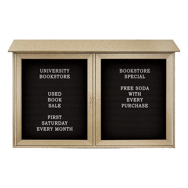 Enclosed Bulletin Board, Letter Board, Board Material Vinyl, Width 45 in, Height 30 in, Board Frame Material HDPE, Frame Color Sand, Board Color Sand, Number of Doors 2, Door Type Swing, Includes (2) Keys, Mounting/Mobility Type Post Mounted, Wall Mounted, Door Material Acrylic, Plastic, Outdoor Enclosed Bulletin Board