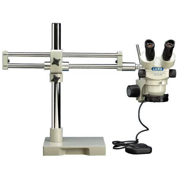 Microscope, Eyepiece Type Binocular, Microscope Type Stereo, Stand Type Dual Boom Roller Bearing, Light Source LED, Optical Field of View 23 mm, Max Specimen Height 195 mm, Optical Magnification 7X to 45X, Maximum Magnification Capability 45X, Vertical Extension 17 1/2 in, Horizontal Extension 26 in, Base Dimensions 10 in x 10 in, Manufacturers Warranty Length 5 yr, Working Distance 195 mm, Eyepiece Protractor Yes