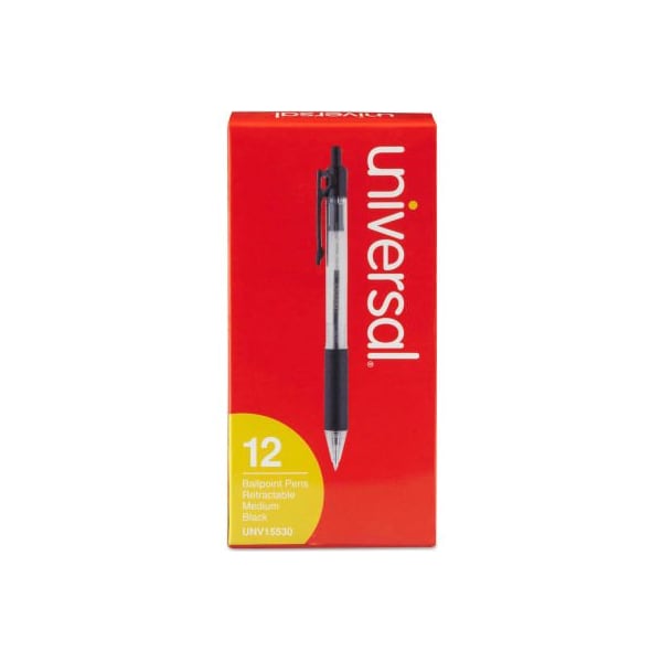 Universal Comfort Grip Retractable Ballpoint Pen, 1mm, Black Ink, Clear Barrel, Dozen