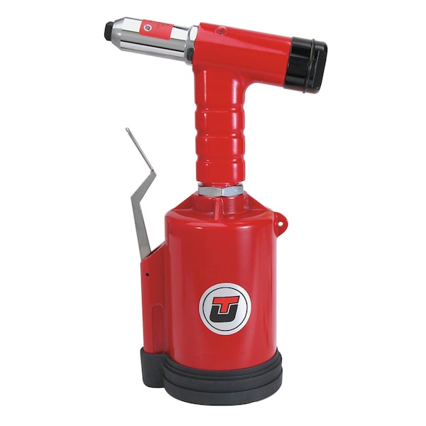 Traction power of 3200 lbs allows installation of aluminum rivets from 1/8" - 1/4"; Alloy steel jaws and forged aluminum hydraulic cylinder for reliability; Supplied with (2) nose pieces (3/16", 1/4") and 1 extra set of jaws; Swivel air inlet for maneuverability; Built-in comfort grip; Best for blind riveting in container, trailer, and RV vehicle assembly