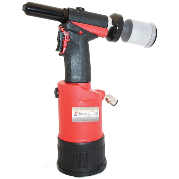 3500 lbs pull force allows use for rivets up to 1/4" - including stainless; Vac feature holds rivet for perpendicular applications; Comfortable trigger with hi-low setting; Swivel air inlet for maneuverability; Rubberized grip for comfort; Detachable mandrel collector cup; Built-in silencer reduces noise output