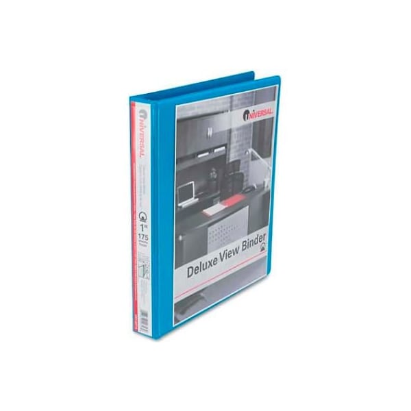 Universal deluxe round ring vinyl view binder, 1" capacity, light blue create the perfect title page, then place it inside the see-through plastic overlay. Wide base rings lock in place to hold pages securely. Two inside pockets for additional storage of loose documents. Included card stock spines are easy to remove, reverse and re-use. Non-stick, heavy-duty cover, deep 3" inside clear pockets. Capacity range [max]: 1"; sheet capacity: 175; color(s): light blue. larger quantity quotes available. Please call 1-888-978-7759. this product arrives to most customers in 2-3 business days.