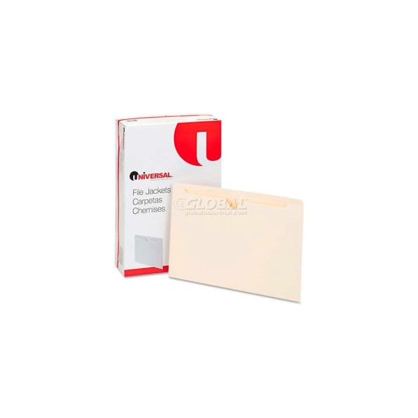 Universal economical file jackets, legal, 11 point manila, 100/box back tab is 1/2" higher than front tab for labeling. Thumb cut for easy access. 11 pt. Manila stock won't bulk up filing cabinets. File jackets/ sleeves/wallets type: jacket; material(s): 11 pt. Manila stock. this product arrives to most customers in 2-3 business days.