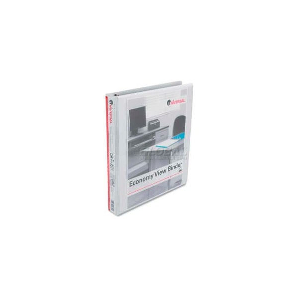 Universal economy d-ring vinyl view binder, 1" capacity, white an exterior, matte-finish, transparent plastic overlay presents limitless customization options when you choose this binder. Say goodbye to page jamming and curling and hello to smooth page turning with this binder's d-ring mechanism. D-ring design means you can store 25% more documents in this binder than a comparable one fitted with round rings. Open and close triggers effortlessly for fast access to binder contents. Identify the material you need fast when you spot this binder's handy spine label. Front cover folds back to create a compact, rigid "mobile desktop" for note-taking on-the-fly. This product was made from wood that came from a certified managed forest. Capacity range [max]: 1"; sheet capacity: 220; color(s): white. larger quantity quotes available. Please call 1-888-978-7759. this product arrives to most customers in 2-3 business days.