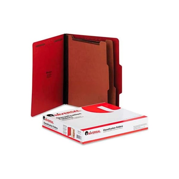 Universal pressboard classification folders, letter, six-section, ruby red, 10/box color-code your filing with heavy-duty covers in vivid colors. Organize and subdivide materials with 2" capacity prong fasteners inside front and back 25 pt. Pressboard covers. 1" capacity metal fastener on each side of 17 pt. Kraft dividers. Tyvek reinforced gusset for added durability during expansion. 2/5 cut tabs, right of center. Classification folder type: top tab; size: letter; number of sections: 6. this product arrives to most customers in 2-3 business days.