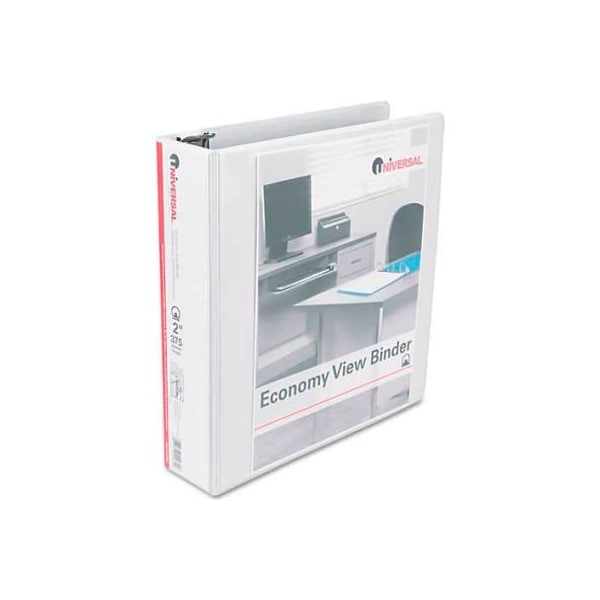 Universal round ring economy vinyl view binder, 2" capacity, white create the perfect title page, then place it inside the see-through plastic overlay. Wide base rings lock in place to hold pages securely. Two inside pockets for additional storage of loose documents. Included card stock spines are easy to remove, reverse and re-use. Extra-deep 3 1/2" opaque inside pockets. Durable, heavy-duty cover. Capacity range [max]: 2"; sheet capacity: 375; color(s): white. larger quantity quotes available. Please call 1-888-978-7759. this product arrives to most customers in 2-3 business days.