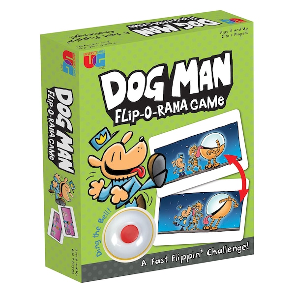 Everyone loves the Flip-o-Ramas from Dav Pilkey's bestselling books! In the Dog Man Flip-o-Rama game, players stack Flip-o-Rama Cards in the middle of the play area and take turns flipping them over. The first player to spot a Flip-o-Rama match dings the Bell. The player to collect the most Flip-o-Rama Cards wins! Each turn presents a hilarious and dynamic challenge, bringing the iconic characters and thrilling moments of Dog Man to life. With easy-to-learn rules, this game is perfect for kids and families alike, offering hours of fun for 2 to 4 players. The game encourages quick thinking, memory, and attention to detail as players work to collect cards by completing Flip-O-Ramas. It's an engaging way to connect with the Dog Man universe while enjoying friendly competition. Whether you're a longtime fan or new to the series, the Dog Man Flip-O-Rama game provides an interactive, screen-free activity that brings the action and humor of the books to the table.