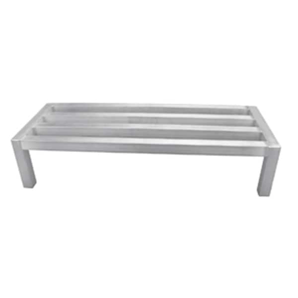 Sanitary off-floor storage per health department. Heli-arc welded aluminum with plastic soles will not rust or damage flooring. -Dimensions: 36in L x 20in W x 8in H.