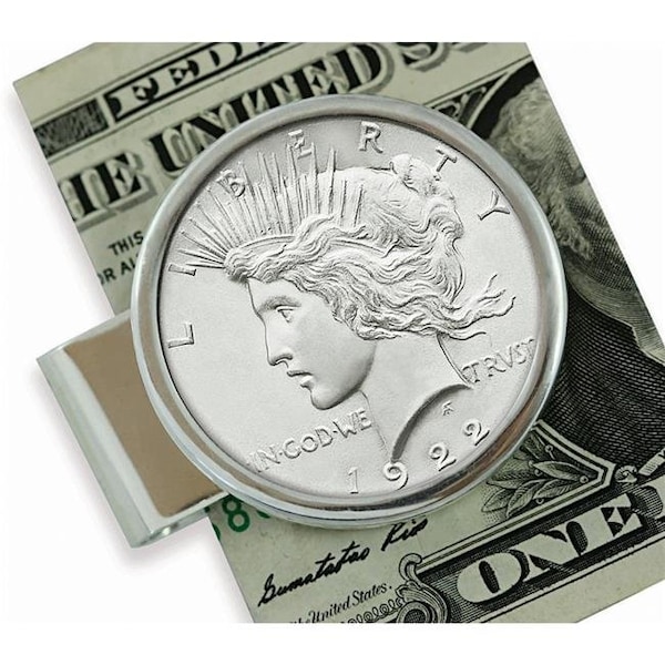 The Peace Silver Dollar was the last United States silver dollar struck for circulation. The head profile of the goddess of liberty is featured on the obverse while a perched bald eagle is on the reverse. The silver dollar coin was minted from 1921 to 1928 and again in 1934 and 1935. It was designed by Anthony de Francisci who based the design of Liberty on the features of his wife, Terese. Secure your bills with the Sterling Silver Peace Silver Dollar Moneyclip.