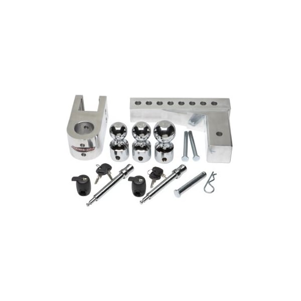 Aluma-Tow 8 Aluminum adjustable ball mount For 2-1/2 oversized square receivers 8 drop and 8 rise. Provides you with one product for all of your towing needs Towing capacity of 12000LB Drop adjustable in 1 increments Included are 3 independent steel Chrome plated interchangeable hitch balls 1-7/8 2 & 2 5/16 covering all vehicle sizes Aircraft Quality. Aluminum Alloy Body Design Is Rust Free & Makes The Product Light Weight While Also Providing Maximum Strength Includes 2 Locking Hitch Pins With 4 Keyed Alike Keys That Prevents Theft While Connected To Your Vehicle and Plastic Carrying Case.