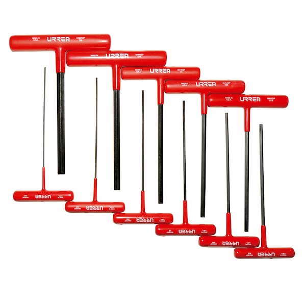 SAE hex keys set of 11 pieces. Cushion grip prevents hands with oil or grease from slipping. Phosphatized offers greater protection against corrosion. Long hex key allows the user to reach fasteners in deep or hard to reach locations. The T-handle permits the application of greater torque thanks to its comfortable grip. Color: Red handle. Ball-end tips: 25° to 90° entry angle for work in hard to reach áreas. The set includes the following tip sizes: 5/64”, 3/32”, 7/64”, 1/8”, 9/64”, 5/32”, 3/16”, 7/32”, 1/4”, 5/16”, 3/8”.