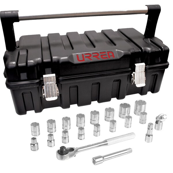 1/2" drive socket set with accessories 21PC. The set includes: 1/2" drive 12pt socket: 3/8", 7/16", 1/2", 17/32", 9/16", 19/32", 5/8", 11/16", 3/4", 25/32", 13/16", 7/8", 15/16", 1", 1-3/16", 1-1/4". 1/2" Reversible Ratchet. Extension 1/2"X2-1/2". Extension 1/2"X5". Universal Joint 1/2". Plastic Tool Box 21X11X7".