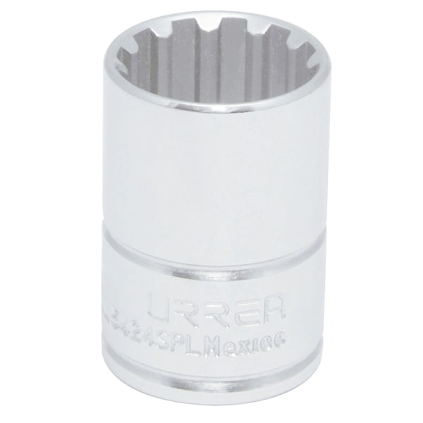 The spline socket design offers higher strength in a more compact profile, making it common on military and commercial aircraft. Urrea spline sockets are made from high quality steel. Polished chrome plated finished. Spline size: 20. Type: II. Inches: 5/8”. MM: 16mm. Length: 5/32". Nut end outside diameter: 1/2". Drive end outside diameter: 5/16”. Nut depth: 9/16”.