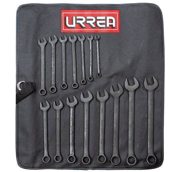 Black combination wrench set of 15 pieces. Precision-machined openings for a perfect fit with nuts or bolts. Available" 12-point design, allowing a 30° recovery angle. High-quality micro-steel alloy and controlled heat treatment. Phosphatized finish ideal for industries where chrome particle shedding is critical. Exceed ASME B107.100 standard. The set includes 15 wrenches sizes: 5/16", 3/8", 7/16", 1/2", 9/16", 5/8", 11/16", 3/4", 13/16", 7/8", 15/16", 1", 1-1/16", 1-1/8", 1-1/4".