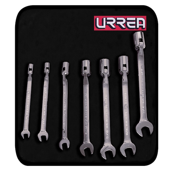 These wrenches combine a fixed open-end with 15° of inclination and a flexible socket that can rotate 180° so it allows working at any angle and it makes easier to work" hard -to reach places. Manufactured with chrome-vanadium steel with a full polished finish. Reinforced design supports torque applied with flex socket 180° rotation. Lobular 12-point socket box-end. Exceed ASME B107.100 standard. The set includes 7 wrenches, sizes: 3/8", 7/16", 1/2", 9/16", 5/8", 11/16", 3/4".