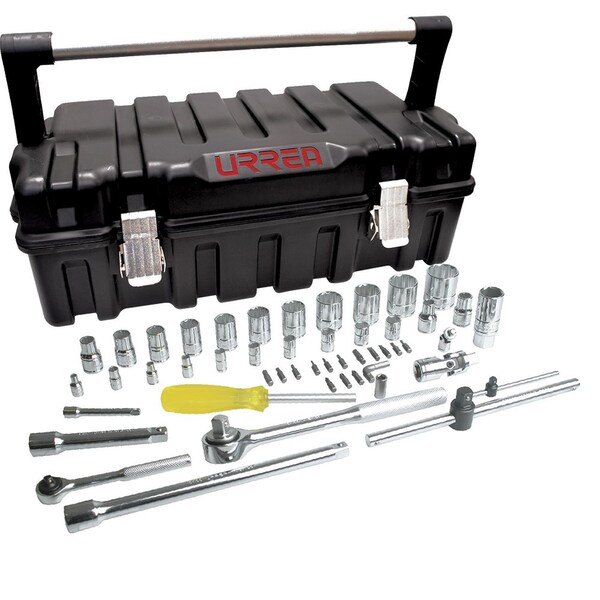 Combination drive sets of 51 PC. The set includes: 1/4" drive 12pt Socket: 5/32", 3/16", 7/32", 1/4", 9/32", 5/16", 11/32", 3/8", 7/16", 1/2", 1/4". Reversible Ratchet Offset. Extension 1/4"X3". Universal Joint 1/4". Sliding Tee Handle 1/4"Dr. 1/2" drive Sparkplug Socket 13/16". 1/2" drive 12pt Socket: 3/8", 7/16", 1/2", 9/16", 19/32", 5/8", 11/16", 3/4", 13/16", 7/8", 15/16", 1-1/8", 1-1/4", 1/2". Rev Ratchet Round Head. Extension 1/2"X5". Extension 1/2"X10". Universal Joint 1/2". Sliding Tee Handle 1/2"Drx9". Magnetic Screwdriver. Plastic Tool Box 21X11X7". 16 Bits for 4754P50-4754P50M.