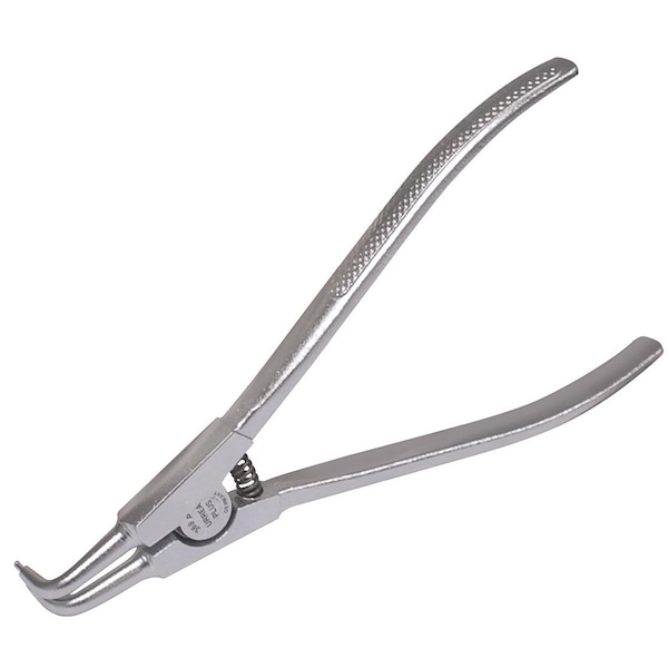 Easily extract rings by inserting the tips in the holes, press and release. Offset pliers. 90° angled tips facilitate extraction of rings fastening machinery elements. For super duty use. Tip diameter: 0.070". Angle:90°. Type: external. Total length: 6-11/16”. Maximum opening: 1.2".