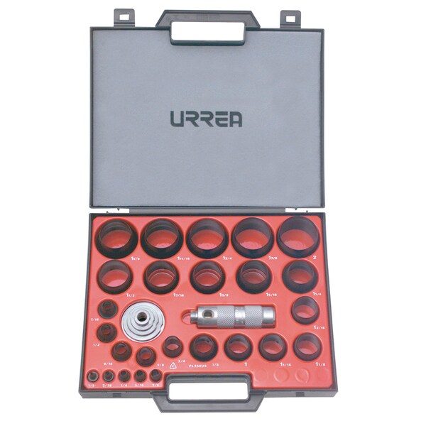 Hitting area, built in handle. Redesigned chuck, capable of holding more than one punch at a time, with retractable centering tip. Gun-type handle, for a more secure and comfortable hit that avoids vibration keeping the hand away from the area of hit. Made of high carbon steel, 53 to 66 oRC hardness, handle made of impact-resistant alloy steel, polypropylene pouch. System to use 2 or more punch at a time. Fields of application: general industrial maintenance and automotive mechanics. Uses: for cutting washers and sealing foam rings, cardboard, leather, rubber, fiber, plastic, lead, thin steel sheet, among others. The set includes: 1/8”, 3/16”, 1/4”, 5/16”, 3/8”, 7/16”, 1/2”, 9/16”, 5/8”, 1-1/16”, 1-1/8”, 1-3/16”, 1-1/4”, 1-5/16”, 1-3/8”, 1-7/16”, 1-1/2”, 1-5/8”, 3/4”, 7/8”, 1”, 1-11/16”, 1-3/4”, 1-7/8”, 2”, Handle adapter, Plastic case.
