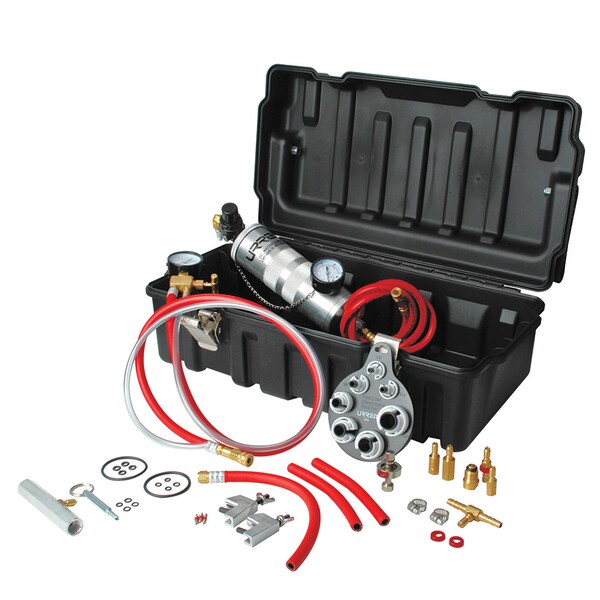 Connects to injector rails eliminating the momentary function of the fuel pump (check the manufacturer’s specifications). The set includes: 7 quick- disconnect fittings for fuel lines, repair ring set, schrader valve tool for adapters, Ford® adapter, quick-change Nissan® “T” adapter, plastic box and buoy with regulator, manometer and hose.